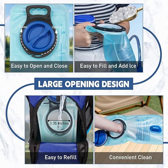 - Large Opening, Easy to Fill and Clean: The CasaCulina 2 liter hydration bladder has a large opening design, and the large 3.5-inch screw cap is easy to open and close. The large opening is convenient for filling liquids and large ice cubes. It is convenient for large hands or professional cleaning kits such as cleaning brushes to enter the interior for comprehensive cleaning and drying