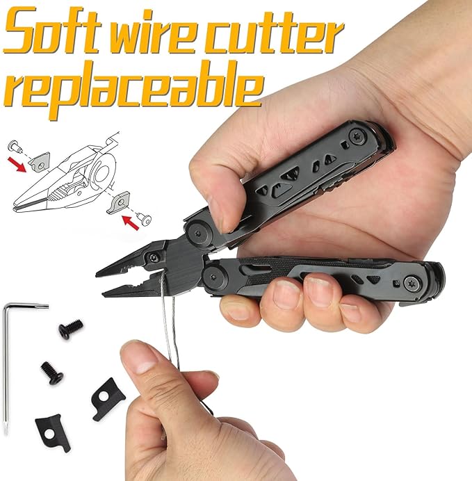 - 【Strong Durable】The multi-tool is very important to you. The fuselage is made of high quality and tough 3Cr13(high hardness stainless steel) and alloy material. Hard wire cutting machine is made of YG10 tungsten. The surface of the foldable tool was sprayed with 10MM antirust coating. To prevent corrosion and ensure long-term durability.Life warranty replacement.