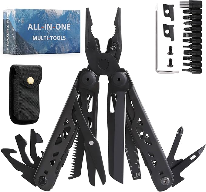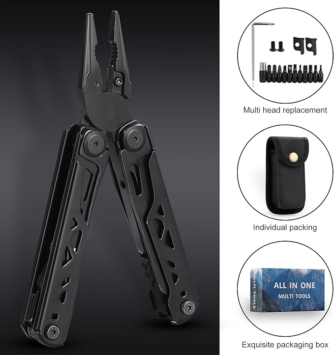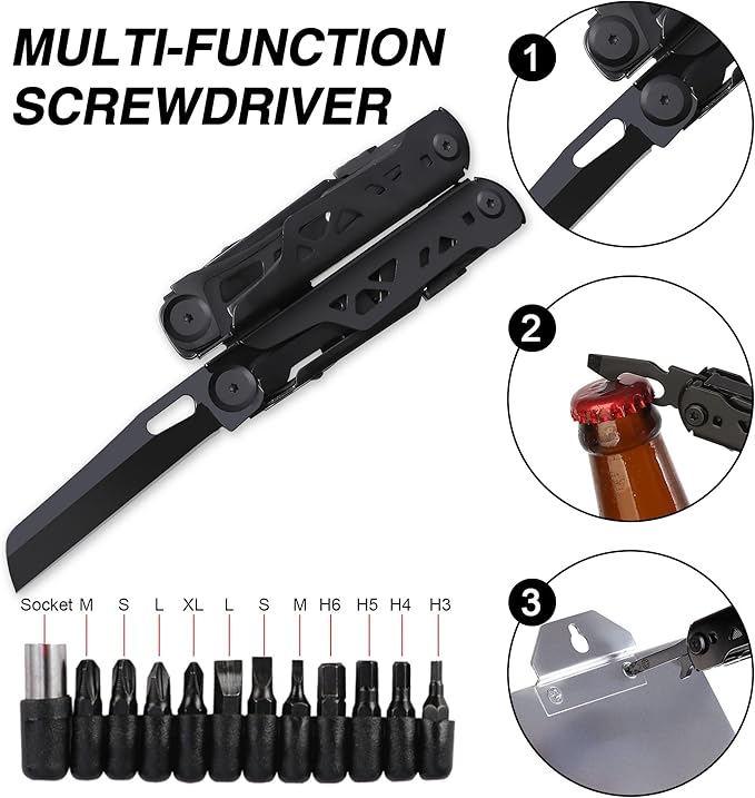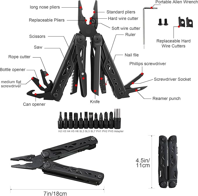- 【32-in-1 Multitool pliers】Multi tools includes 32 functions such as pliers, Screwdriver with replaceable head, replaceable hard wire cutter, wire stripper, punch, saw, scissors, ruler, can opener and bottle opener. All tools are equipped with a safe and reliable self-locking structure. Easy to fold and carry around.