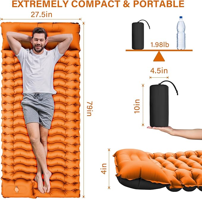 Camping Sleeping Pad, Ultralight Camping Mat with Pillow Built-in Foot Pump Inflatable Sleeping Pads Compact for Camping Backpacking Hiking Traveling - Orange