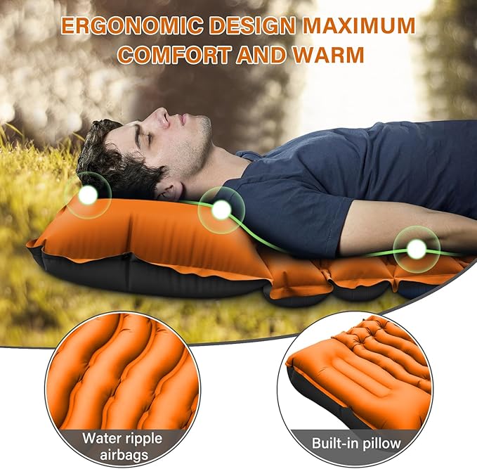 Camping Sleeping Pad, Ultralight Camping Pad with Pillow, Built-in Foot Pump Inflatable Sleeping Pad, Compact Size for Camping, Backpacking, Hiking - Orange