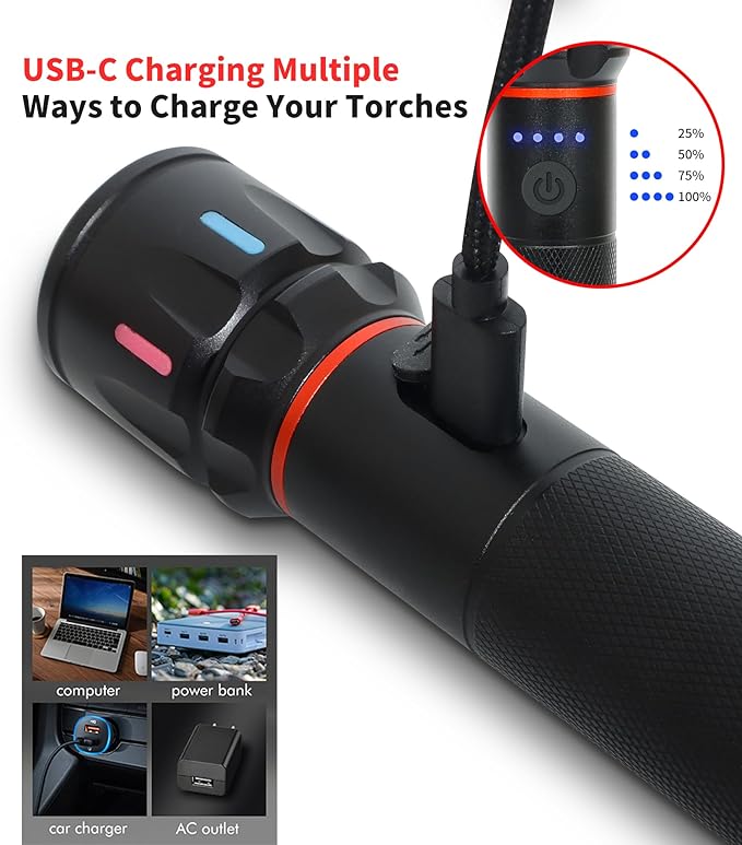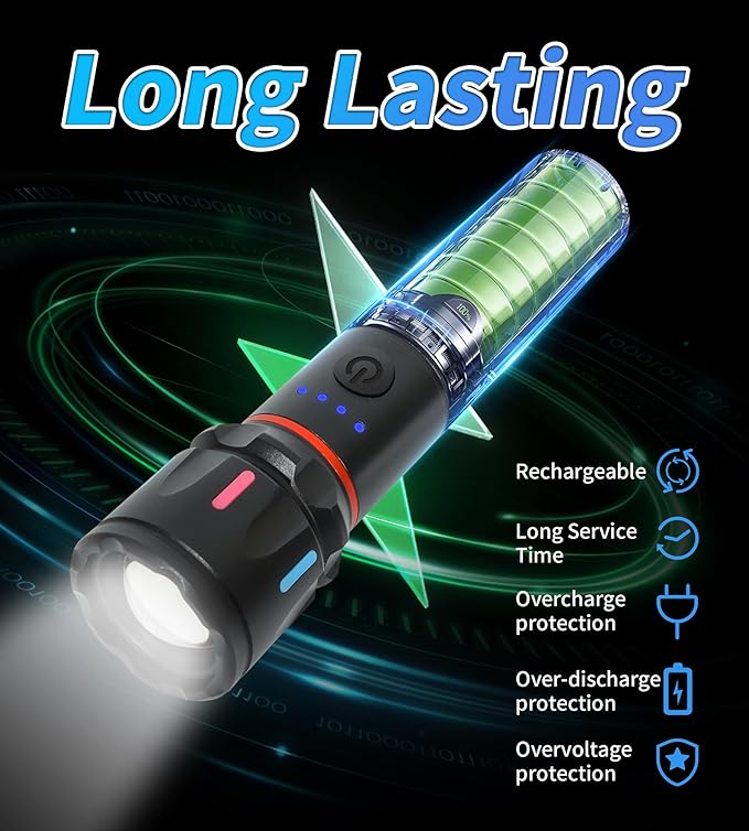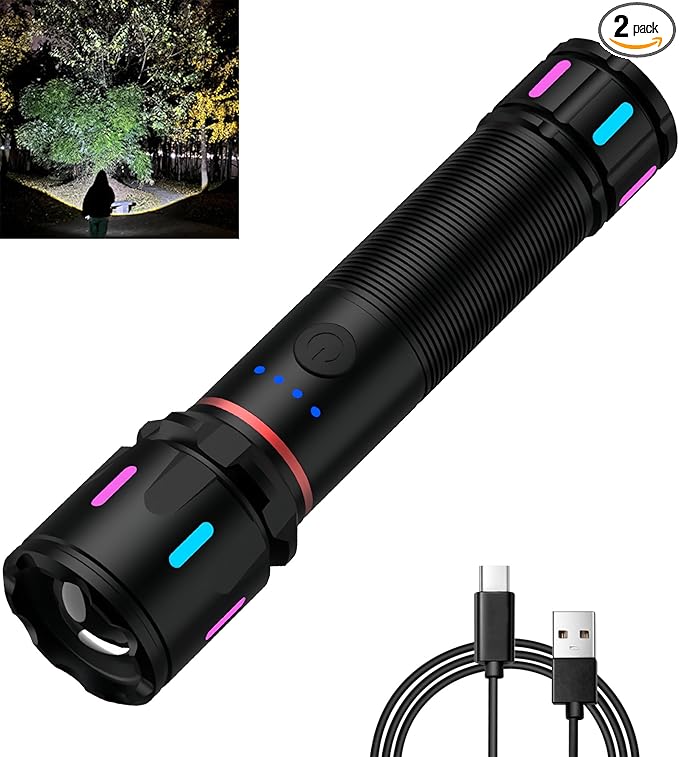 - 【2 Pack】Our handheld flashlights are equipped with a high-capacity 3000mAh rechargeable battery, providing you with a reliable and long-lasting power source. These flashlights can last up to an impressive 10+ hours with the low mode, ensuring that you have sufficient lighting during emergencies or outdoor adventures