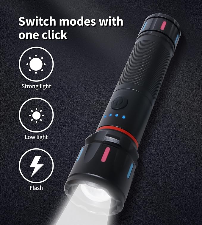 - 【Multifunctional】 The high lumens flashlights offer 3 different light modes - high, low, and strobe - allowing you to easily adjust the brightness according to your specific needs. Additionally, these flashlights feature a telescopic zoom design, enabling you to focus the beam for precise illumination at various distances