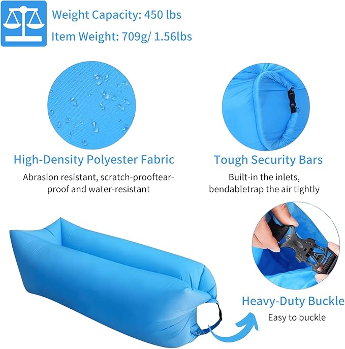 - 【Ultimate durability】-Inflatable couch made of rugged, waterproof polyester (210T) that can withstand sun, water, dirt and bugs! Lightweight and tear-resistant. It will air for at least 5-6 hours. Weight capacity 450 lbs. for 3 adults at a time. This is a must-have for any BBQ, Pool Party, Beach, Hike, Concert, or Camping Trip.