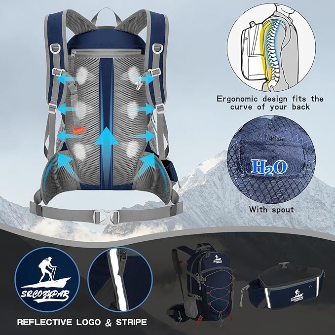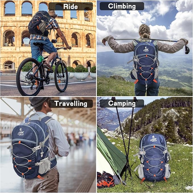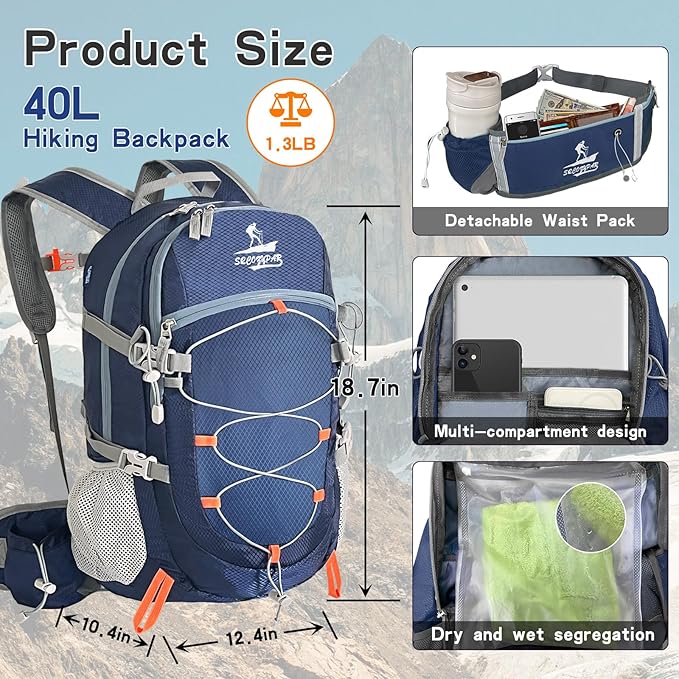 - LIGHTWEIGHT TRAVEL BACKPACK: This portable hiking backpack has a large storage capacity of 40 liters, collapsible travel backpack is designed with a multi-compartment backpack, a main zippered compartment, a zippered front pocket, a rear wet pocket, and two side pockets, as well as a removable hidden waist pack, large enough space to help you organize more hiking gear, and the rear wet pocket backpack can effectively protect your electronics from moisture, or separate wet clothes from them