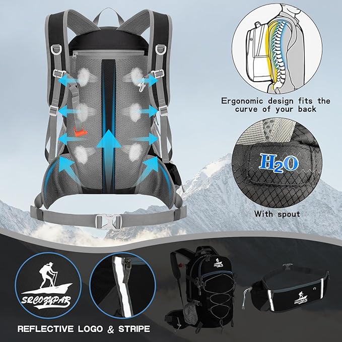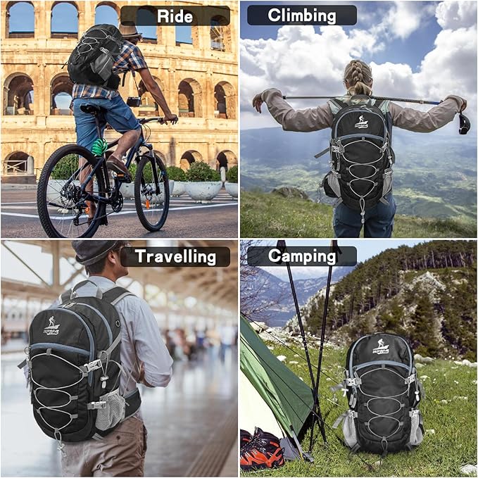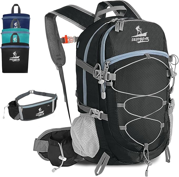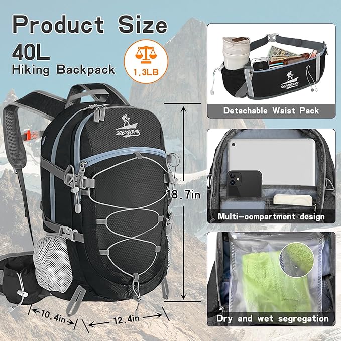 - LIGHTWEIGHT TRAVEL BACKPACK: This portable hiking backpack has a large storage capacity of 40 liters, collapsible travel backpack is designed with a multi-compartment backpack, a main zippered compartment, a zippered front pocket, a rear wet pocket, and two side pockets, as well as a removable hidden waist pack, large enough space to help you organize more hiking gear, and the rear wet pocket backpack can effectively protect your electronics from moisture, or separate wet clothes from them