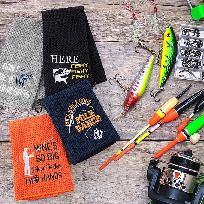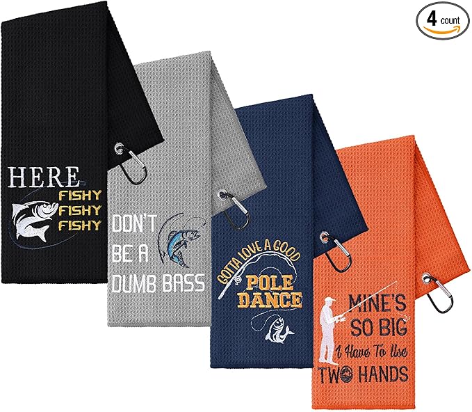 4 Pcs Microfiber Fishing Towels with Clip Waffle Pattern Bait Towels for Effective Cleaning of Fishing Gears or Dirty Hands 16''x24'' Funny Embroidered Towel for Fly Fishing Kayaking Hiking