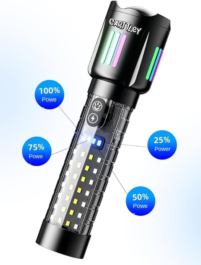 - WIDELY USED & OUTDOOR ESSENTIAL HANDHELD FLASHLIGHTS】This rechargeable Flashlight for emergencies can be used as an emergency energy source to charge some common USB devices, such as cell phones, headphones, etc. Powerful Flashlights high lumens are not only suitable for daily use such as camping, night dog walking, night running, night fishing, night riding, hiking, but also for police night patrol, car maintenance and other workplace such as gas stations, charging stations, chemical labs, airports, warehouses, etc.