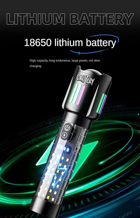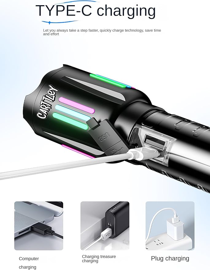 - 【POWERFUL BATTERY & USB RECHARGEABLE Flashlight】Built-in fast charging chip, twice as fast as the charging speed of ordinary USB Flashlight rechargeable. This high-power Flashlight can work about 8-20 hours on a single charge. With circuit protection, such as overcharge protection, over-discharge protection, over-voltage protection, short-circuit protection, etc., which can extend the life of the Flashlight high lumens rechargeable up to 200000 times.