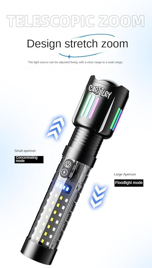 - EMERGENCY FLASHLIGHT -- This rechargeable flashlight can be used as an emergency energy source to charge some common USB devices, such as cell phones, headphones and so on. It is not only suitable for daily use such as camping, night dog walking, night running, night fishing, night riding, hiking, etc., but also for police night patrol, car maintenance and other workplaces such as gas stations, charging stations, chemical labs, airports, warehouses and so on.