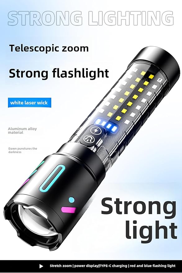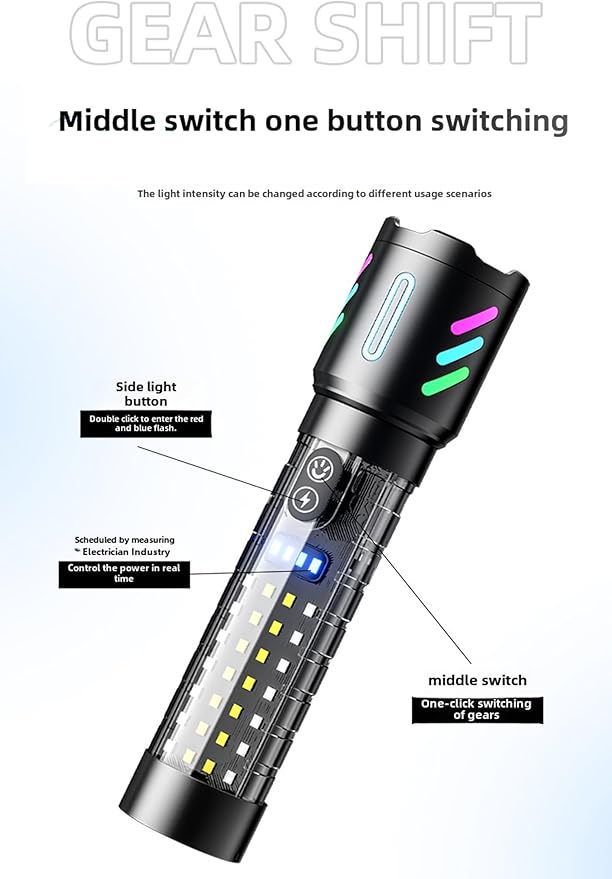 - ăWITH ZOOMABLE ADJUSTABLE & 6 LIGHTING MODESăCompared to the traditional Flashlights with only 5 modes (high/medium/low/sos/double flash), our powerful Flashlights with 2,000,000 lumens have a new super bright mode to meet the brightest lighting needs. In addition, we have set up a separate function key to the Super Bright Flashlight to make the sos and double flash functions more convenient to use.