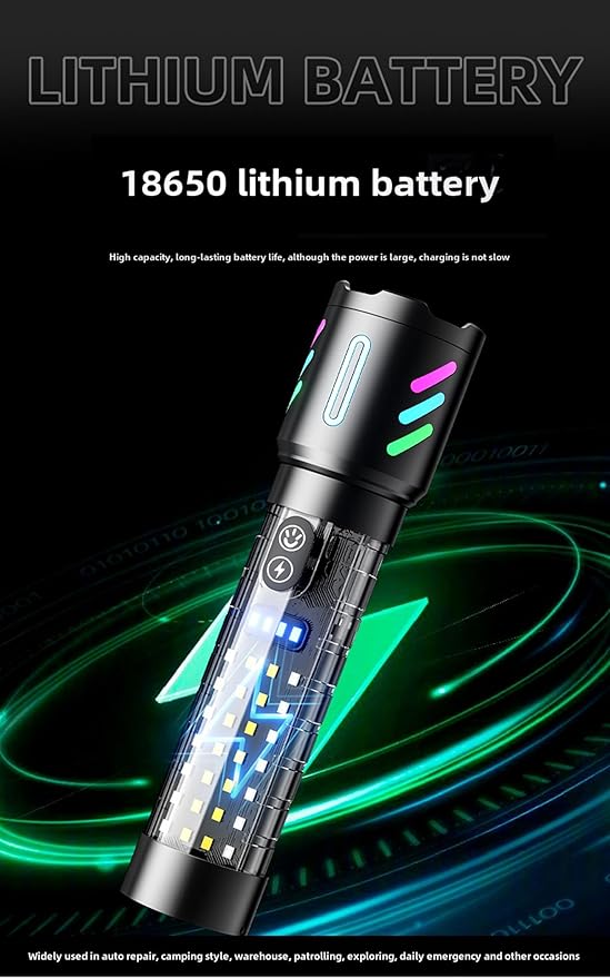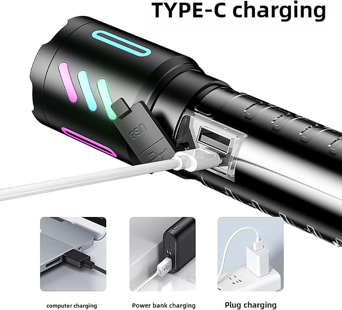 - ăPOWERFUL BATTERY & USB RECHARGEABLE FlashlightăBuilt-in fast charging chip, twice as fast as the charging speed of ordinary USB Flashlight rechargeable. This high-power Flashlight can work about 8-20 hours on a single charge. With circuit protection, such as overcharge protection, over-discharge protection, over-voltage protection, short-circuit protection, etc., which can extend the life of the Flashlight high lumens rechargeable up to 2000000 times.