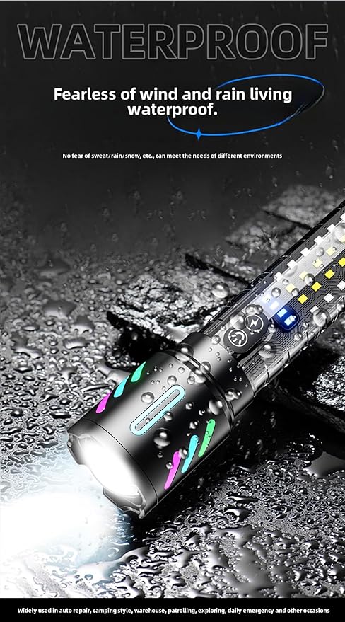 - ăIP67 WATERPROOF & SHOCKPROOF TACTICAL FLASHLIGHTăThe Super Bright rechargeable Flashlight is specially made of aviation grade aluminum alloy all over. With the thick rubber ring can do IP67 level of waterproof, dust-proof, drop-proof. There is no problem to use the rechargeable Flashlights in extreme weather such as heavy rain and snowstorm. We also customize the tactical Flashlights with five parts of heat dissipation area, so the bright flashlight has good heat dissipation performance.