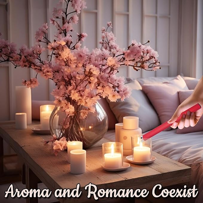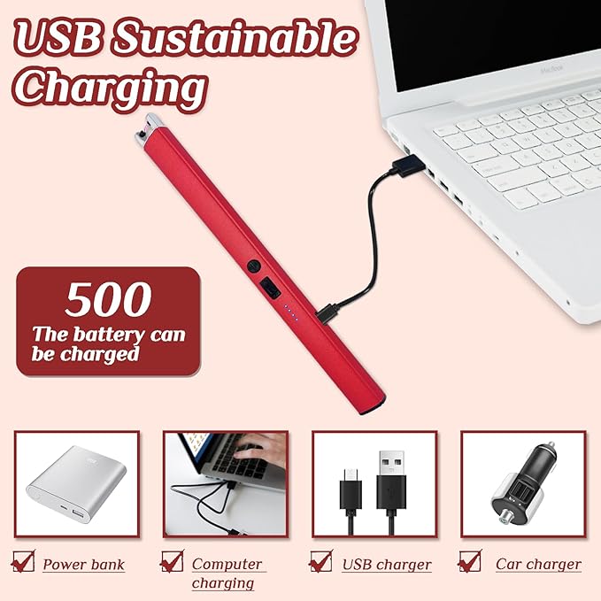 - [Easy Charging, Convenient Life] - The electric candle lighter is equipped with a USB charging cable, which is convenient for you to charge anytime and anywhere. There are 4 power indicator lights on the lighter handle. When only one light is on, please charge it in time. Each charge only takes 60 minutes to be fully charged. When fully charged, all 4 LED lights will light up. This rechargeable lighter can be charged over 500 times, so you don't have to worry about long-term use.