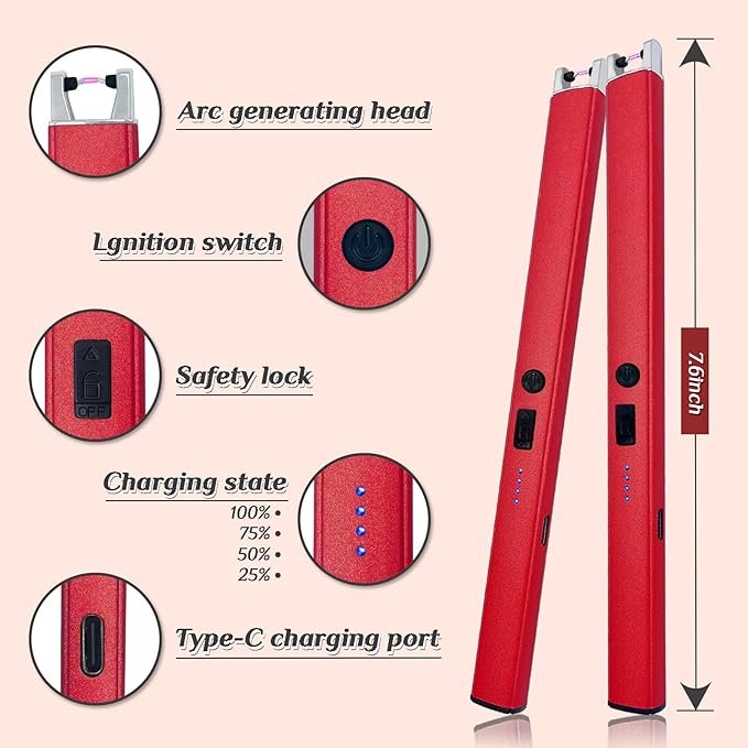 - [Safety Is Our Primary Responsibility] - The candle lighter use automatic power-off technology, which will automatically shut down after 7 seconds of each use, effectively reducing the possibility of over-discharge of the electric lighter. The child safety lock function is also added to prevent accidental activation. When using it, you need to open the safety lock first and then press the ignition switch to start working, to ensure the safety of you and your family.