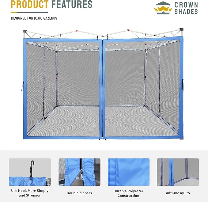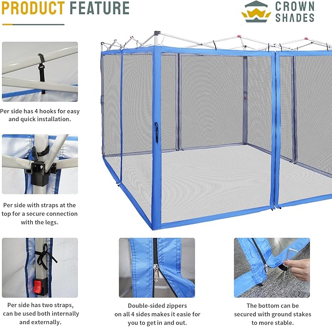 CROWN SHADES Gazebo Mosquito Net for 10 x 10 Pop Up Canopy - Patio Gazebo Mesh Sidewall with Zipper for Outdoor Tent, Garden and Backyard (4 Packs, Blue