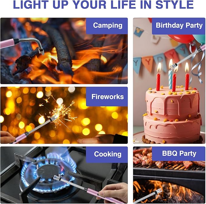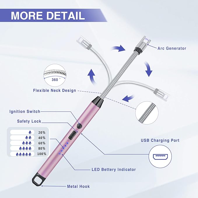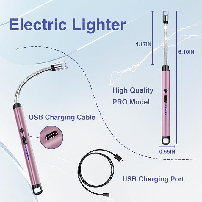 - [BRING YOU A HIGHER QUALITY LIFE]--This USB rechargeable lighter give you a higher quality of life, as it does not produce pungent gases and is compact and portable. Meanwhile, the windproof design makes it unaffected by rain, snow, strong winds and other inclement weather, electric lighter perfect for outdoor, camping, barbecue.The 360 ° flexible rotating long neck design reduces unnecessary worries by lighting aromatherapy, candles, and fireplaces in daily life.