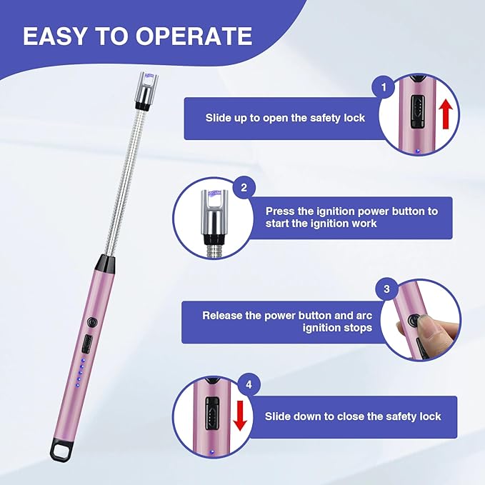- [YOUR SAFETY IS OUR CORE CONCEPT]--The candle lighter adopts plasma arc and flame-less technology, with no oil, gas, or flame design is safer than ordinary fuel lighters. It not only adds a safety switch lock that prevents children from accidentally touching it, but also sets the function of automatic power-off every 10 seconds, which can effectively stop over-discharging or overloading, providing a guarantee for your safety.