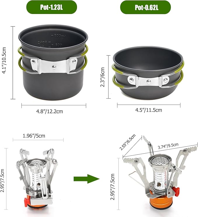 - 【 SAVE YOUR SPACE】Equipped with innovative foldable handles, our camping pot and pan set maximizes storage efficiency in its accompanying bag. The camp stove can also be folded to save space . Our camping pots and pans set weighs a mere 1 lbs, making it effortlessly portable for backpacking and camping excursions.