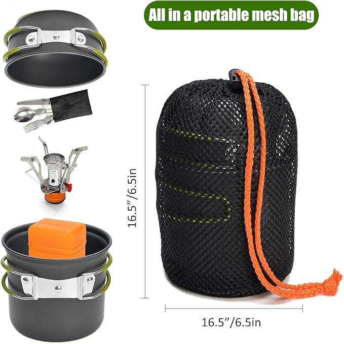 - 【HUMANIZED DESIGN】 Scale measurement design on the camping pot could save your time greatly. The handle can be folded, super easy for storage. Included Mesh Bag,all the stuffs can be packed together, so as your gas tank. This set is special designed for daily backing, small size and enough space for your gas tank.