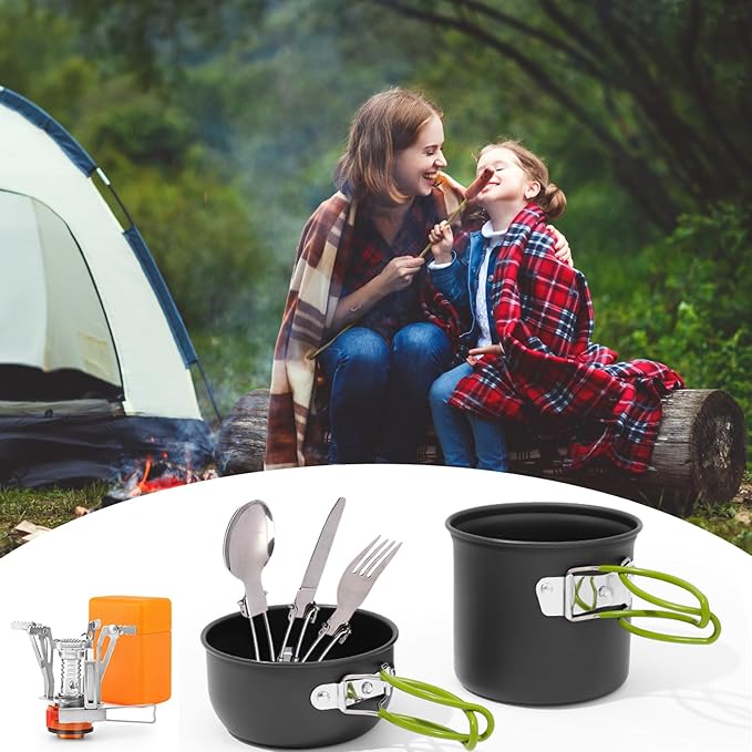 Camping Cookware Set Portable Backpacking Stove Kit, Mini Camp Stove with Non-Stick Lightweight Pots Pans and Stainless Steel Fork Knife Spoon for Outdoor Camping Hiking Cooking Gear