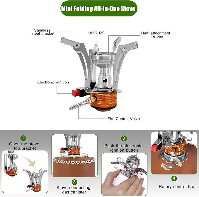 - 【Camp Cooking Kit with Stove】The 6pcs camping cookware mess kit includes anodized aluminum non-stick camping pot x 2, mini backpack stove x 1 (no gas),knives x 1, spoons x 1, folks x 1. Walking "kitchen", can be packed into a backpack or travel bag, designed for 1-3 people.Compatible with any 7/16 threaded single butane/butane-propane fuel mix tank (EN 417). Camp stoves are not suitable for propane canisters (Note: fuel is not included).