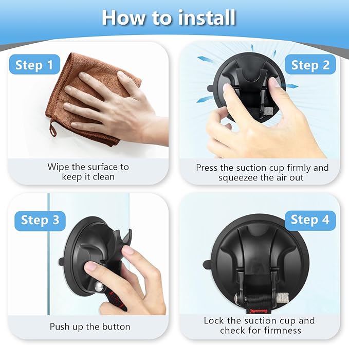- 【Easy to install 】This suction cup hook has no glue,So easy to install and take off.To ensure a firm bond, Before installing the suction cup tie downs,Please make sure that the surface of suction cups and installation position are clean.