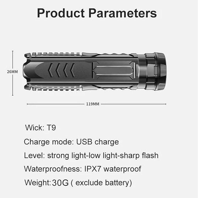- 【Large Capacity】The multifunctional rechargeable flashlight has a built-in rechargeable lithium battery with high efficiency. The battery capacity is large and the standby time is long. The multifunctional rechargeable flashlight also has a T9 high-light core, which can continuously illuminate for 5-30 hours.