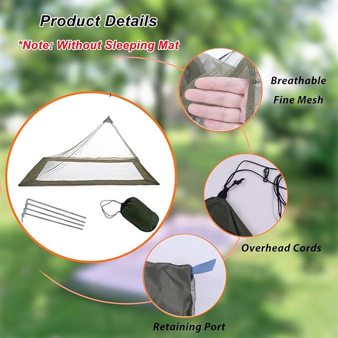 - Package Include : 1 x Mosquito Nets Tent and 4 x Retaining tools.Note : without Sleeping Mat