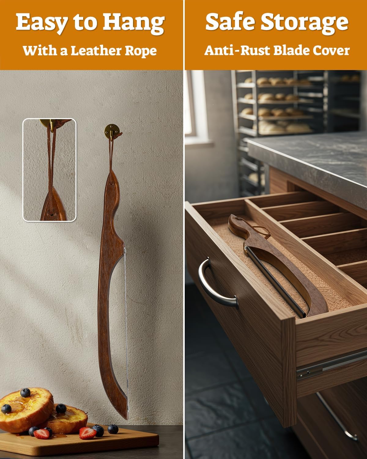 - Premium Bow Body: Crafted from Pine wood, the sourdough bread baking supplies feature a beautifully designed bow body that not only enhances aesthetic appeal but also provide exceptional durability. The natural properties of this bread cutter make it resistant to moisture and decay, ensuring a long-lasting tool for your kitchen. The ergonomic design of the bread knife for homemade bread allows for a comfortable grip, making slicing effortless