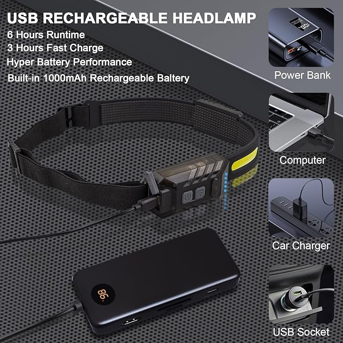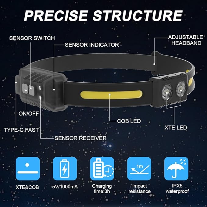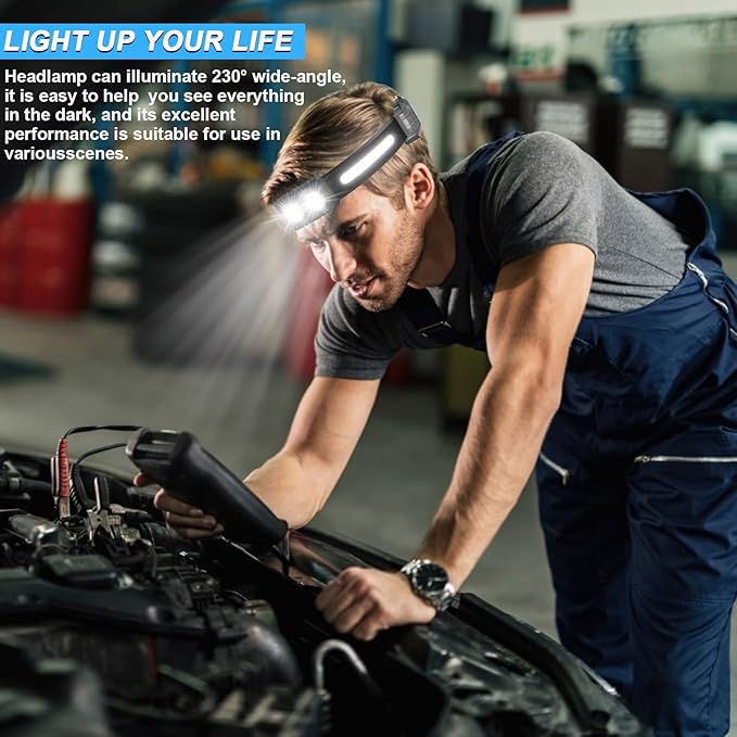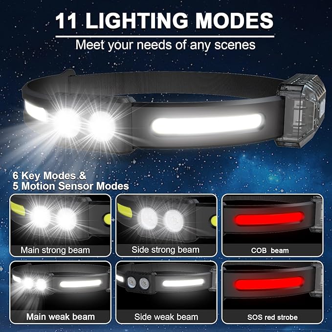 - Six lighting modes, as you please: headband light Includes various lighting combinations such as COB+XTE dual light, XTE main light, COB wide-angle, COB red light, sensor mode, etc. Whether it's reading, repairing, or emergency signals, there is always one mode to meet your needs and easily cope with various scene challenges.