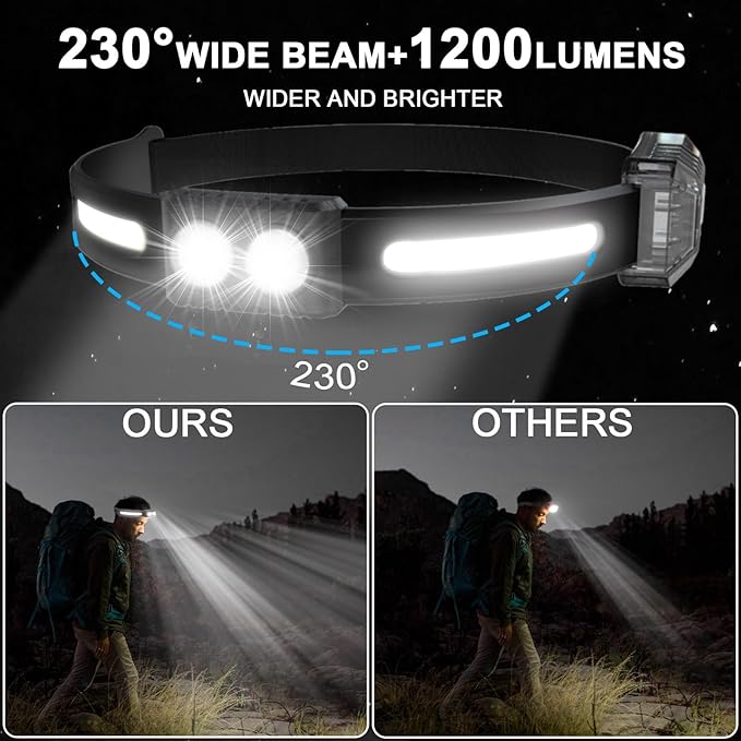 - 230 ° wide-angle lighting with unbounded field of view: Our headlamp rechargeable adopts COB and XTE dual light source technology, bringing unprecedented 230 ° ultra wide angle lighting with 1200 lumens of brightness, eliminating blind spots in your nighttime vision.