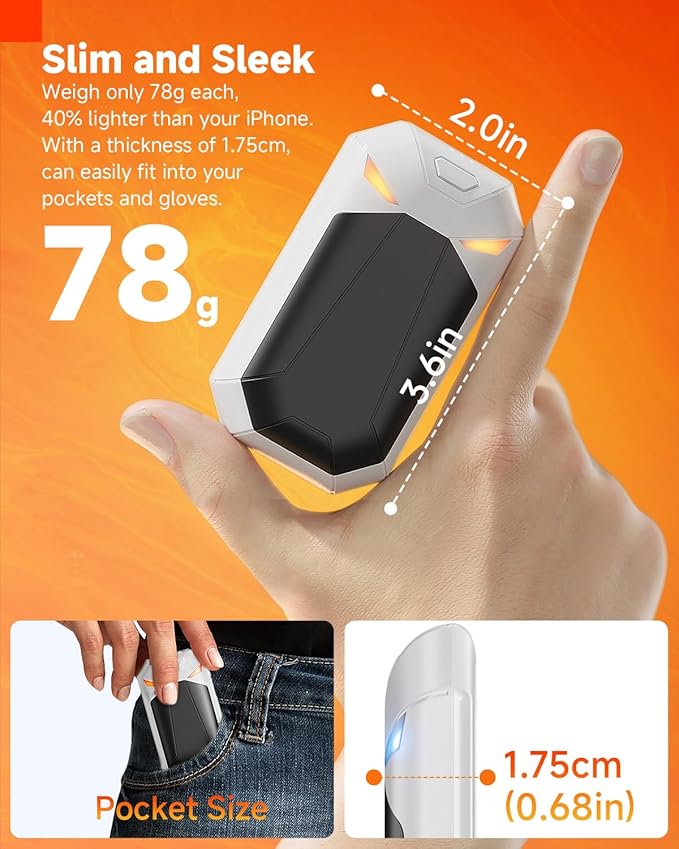 - 【Ultra-Light and Thin】- The electric hand warmers weigh 78g each and are only 1.53cm thick. With natural curves and a comfortable, delicate touch, they fit snugly in your palm and easily warm up for hours.