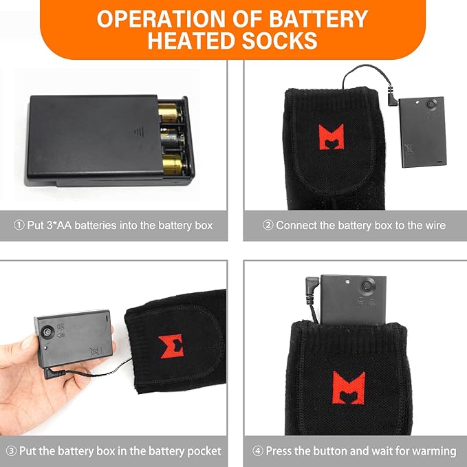 - 【Battery Heated Socks】: Heated socks equip with 2 battery boxes, powered by 3*AA batteries (not included), just need 6* AA batteries, you will get heating time up to 2-5 hours.