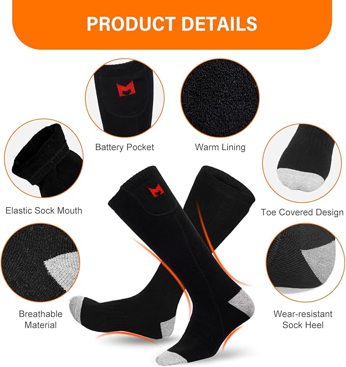 - 【Necessary for Winter】: With the electric heating socks, you can enjoy your fishing, camping, snowboarding, hunting, hiking, skiing, snowboard, and outdoor work, etc. in cold winter.