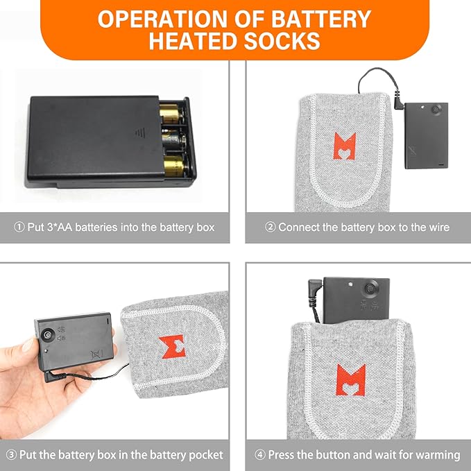 - 【Battery Heated Socks】: Heated socks equip with 2 battery boxes, powered by 3*AA batteries (not included), just need 6* AA batteries, you will get heating time up to 2-5 hours.