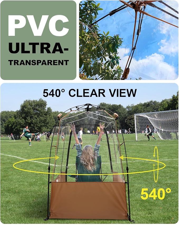 - γβοΈπππππ πππππ ππππππβοΈγ This sport pod tent made from ultra-transparent PVC, offers a clear 540-degree panoramic view. Ideal for outdoor games such as soccer, baseball, softball, field hockey and variety outdoor activities such as fishing, camping, BBQ. Also the fully transparent roof is perfect for stargazing at night. It is designed in a stylish and luxurious manner giving you a five-star outdoor experience in most weather conditions.
