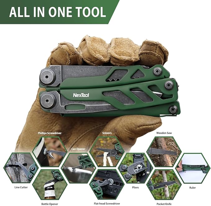 NexTool Flagship Pro, Multi Tool, Multitool Pliers with Folding Scissors, Replaceable Wire Cutters and Safety Locking, Multi Tool Pocket Knife, Survival Tools with Glass Breaker, Gifts for Men-Green