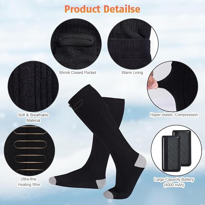 Heated Socks for Men Women with 5V 4000mAh Rechargeable Battery Powered Machine Washable Thermal Heating Socks Electric Foot Warmer Winter Outdoor Skiing Hunting Camping
