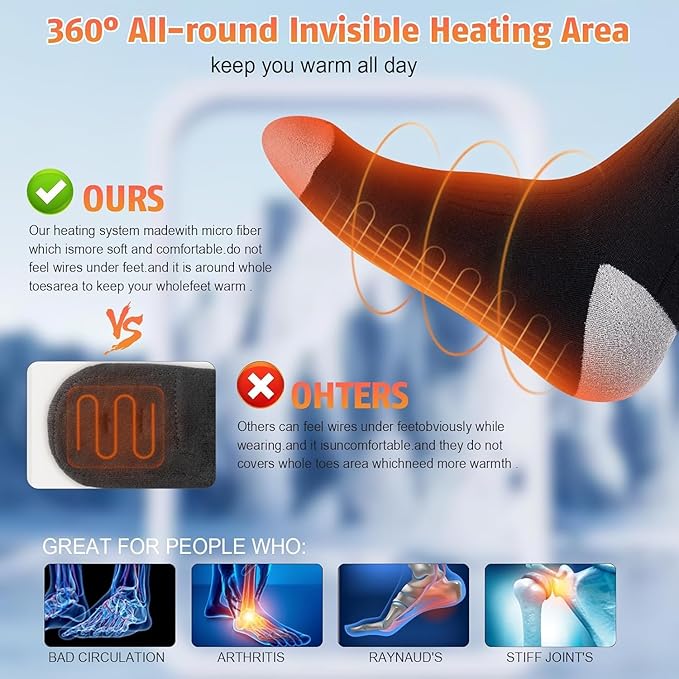 - 🔥High-quality Warm Fabric Heating Socks: The heated socks are designed with multi-layer fabrics, the heating wire is hidden in the fabric and integrated with the socks, 360°wrapping the foot area, no foreign body feeling, comfortable to wear. Wraparound heating keeps feet and body warm. The battery sock fabric is also very flexible and long enough to be worn with sneakers, leather shoes, boots, and rain boots. Support machine wash and hand wash.