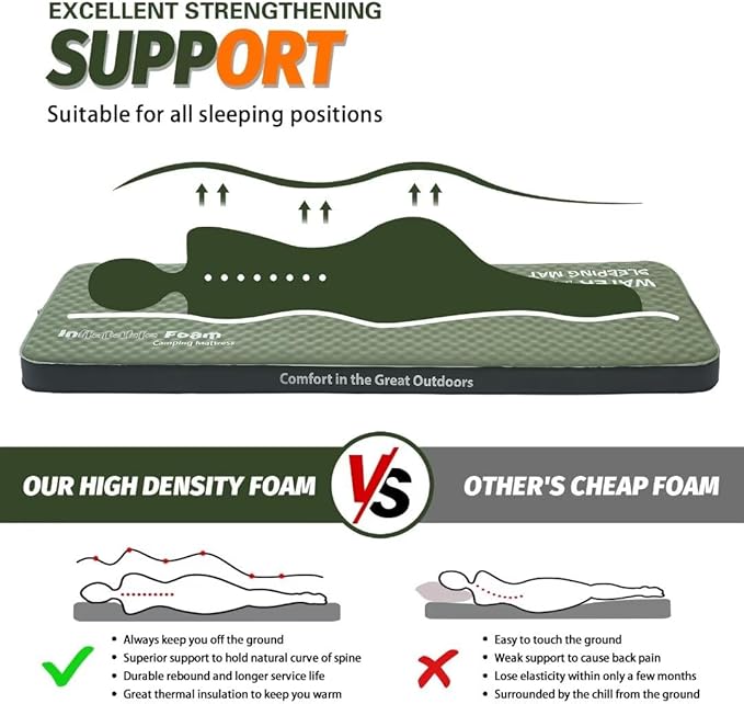 - Comfortable Foam Mattress:The internal structure of this sleeping pad allows the highly resilient foam and air to distribute the weight dramatically and evenly, relieving pressure on the body at different contact points of the camping mattress and creating incredible softness and support, because of the combination of air and foam you can adjust the softness as you wish, providing a much higher level of personalisation and comfort than single material foam sleeping pads