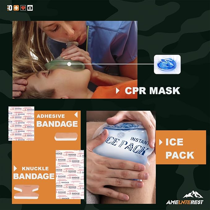 - ✅【Camping First Aid Kit】Our top-quality camping first aid kit is designed to provide essential medical supplies and treatment options in emergency situations. It is equipped with an emergency blanket, non-woven medical tape, an alcohol pad, cotton swabs, scissors, gloves, tweezers, and other essential items to treat common injuries during camping trips.