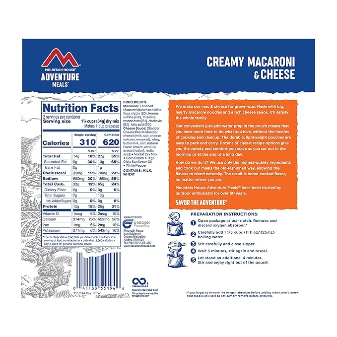 - DELICIOUS MEAL! Macaroni noodles in a smooth, creamy, and very cheesy sauce. Freeze-dried to lock in nutrients and freshness. No refrigeration needed.