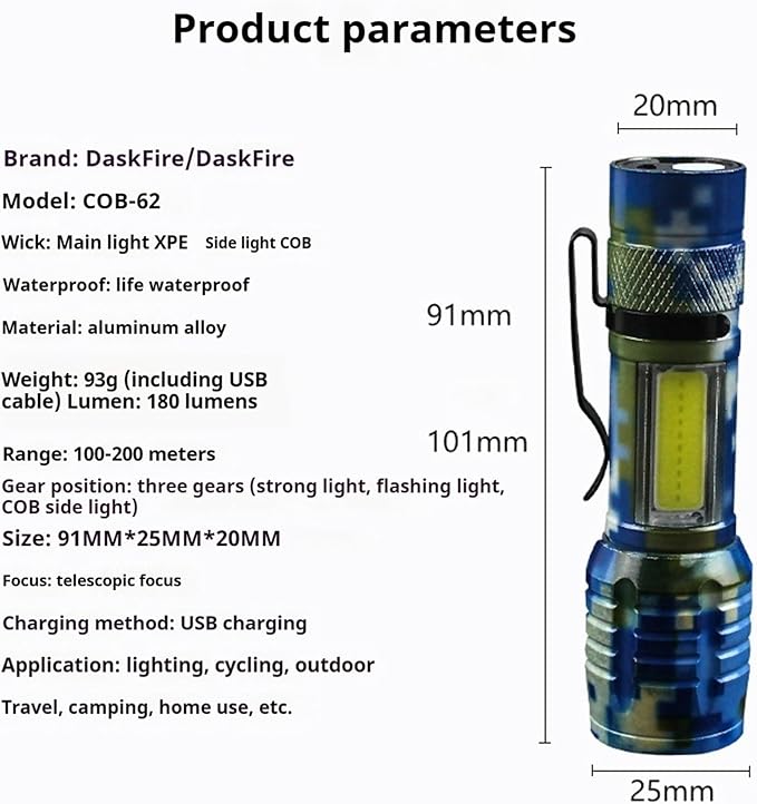 - EMERGENCY FLASHLIGHT -- This rechargeable flashlight can be used as an emergency energy source to charge some common USB devices, such as cell phones, headphones and so on. It is not only suitable for daily use such as camping, night dog walking, night running, night fishing, night riding, hiking, etc., but also for police night patrol, car maintenance and other workplaces such as gas stations, charging stations, chemical labs, airports, warehouses and so on.