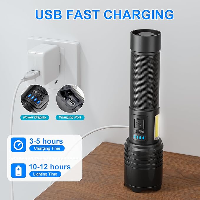 - [3-Hour Fast Charging & Power Display] To make better powerful flashlights, we have made an upgrade in charging, and the super chip equipped can achieve a 3-hour fast charge, which is 200% faster than other flashlight. There is a USB charging cable, the bright flashlight test can be charged more than 250,000 times, with a 25%/50%/75%/100% power display. Built-in charging protection, so that the flashlight service life is longer.