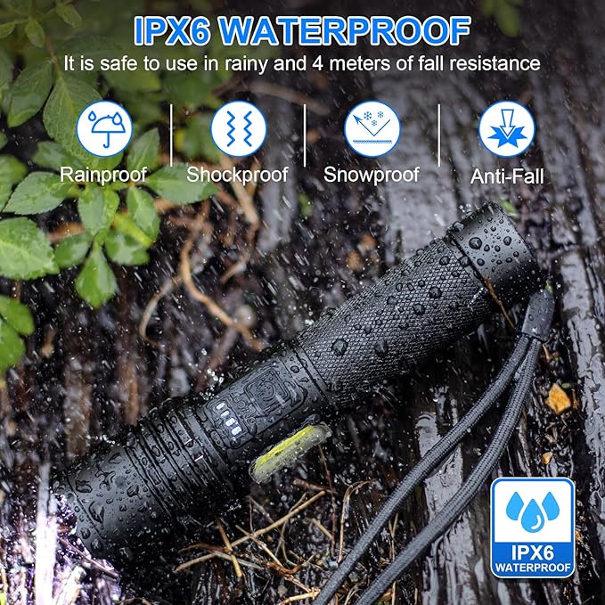 - [IPX6 Waterproof] NiaoChao flashlight is a professional multifunctional flashlight, that uses military-grade aluminum alloy material, with IPX6 waterproof, through the innovative process to achieve an all-inclusive build, waterproof and dustproof and other aspects to a higher level. It has a 13Ft-high anti-drop and can be used normally in harsh environments such as rain and snow. Perfect for outdoor night walking, camping, cycling, etc., let you experience more fun!