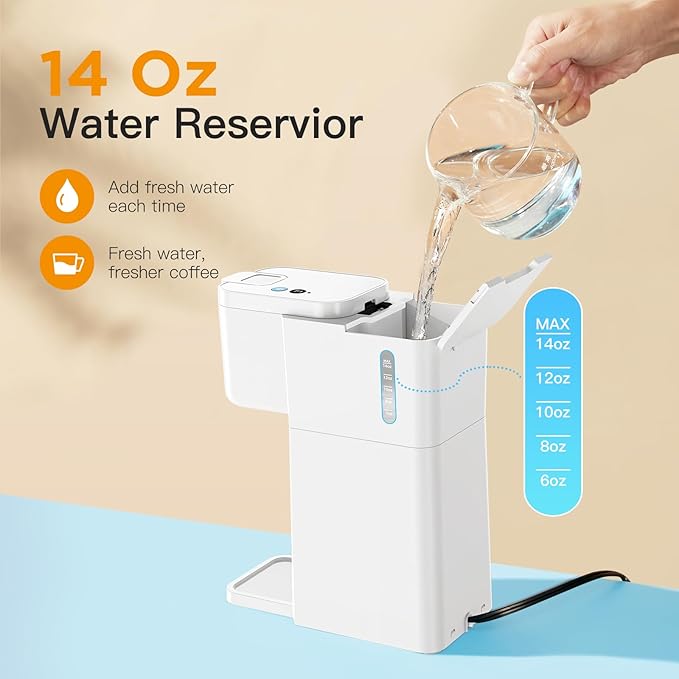 - 6~14oz Brew Size: Adjust the brew amount by filling to the appropriate ounce level. Water tank is not removable and needs to add water each time for fresher and more flavorful coffee