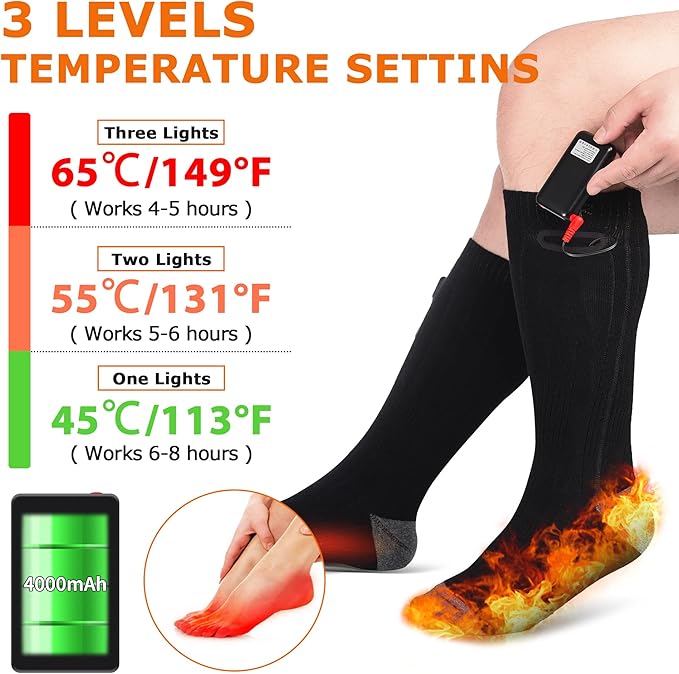 - ◆🌡️【3 Heating Settings】 heating socks include high heat (155-160°F, 4-5 hours), medium heat (140-150°F, 5-6 hours) and low heat (115-120°F, 8 hours), making these heated socks very suitable for fishing, Camping, hiking and working outdoors.
