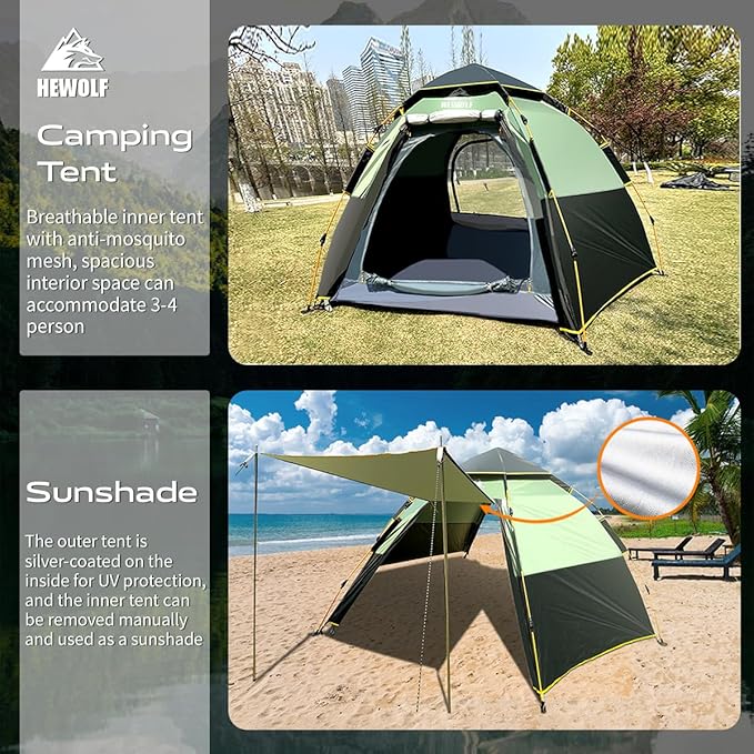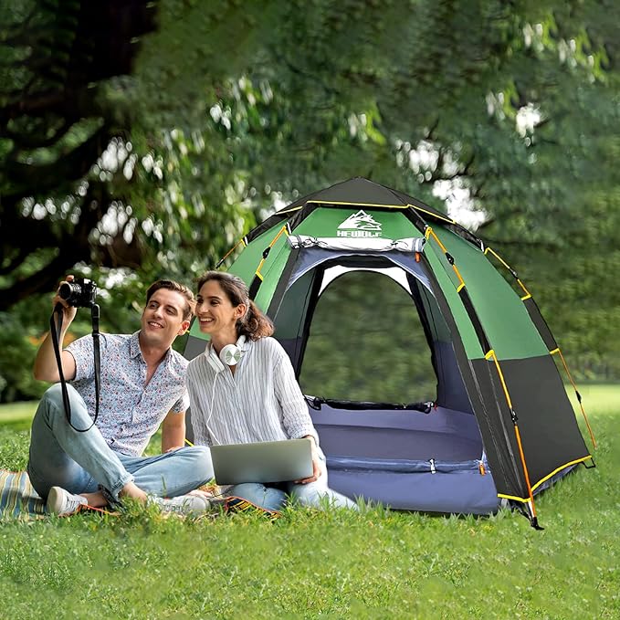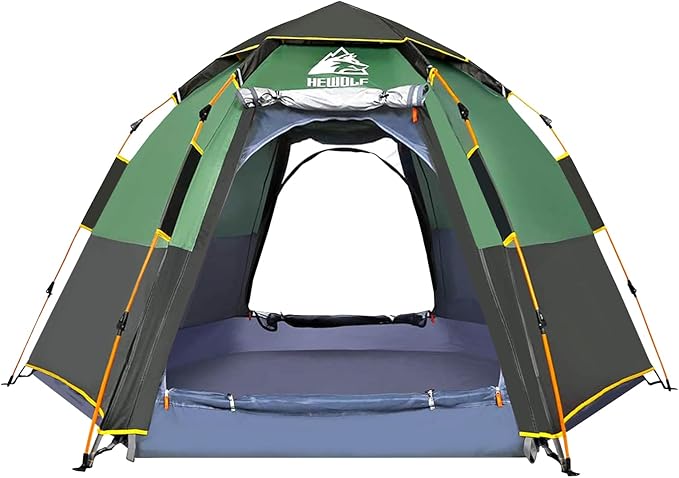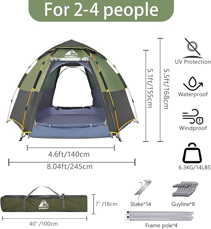 Hewolf 2/3/4 Person Camping Tent - Instant Pop Up Waterproof 2 Doors Tent with Easy Setup | 3-Season Hexagonal Dome Design for Family, Hiking & Traveling