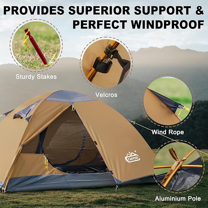 - 【Superior Waterproof & Weatherproof Performance】Engineered for extreme weather, this 2 person tent features a durable 210T rainfly with a 3500mm waterproof rating and a 300D Poly Oxford floor with a 4000mm waterproof rating. Seam taping used on zippers, velcro wrap & bathtube’s 4 bottom corner, ensuring you stay dry even during heavy downpours. This waterproof tent can withstand rain, wind, and harsh conditions, making it perfect for camping in unpredictable environments.